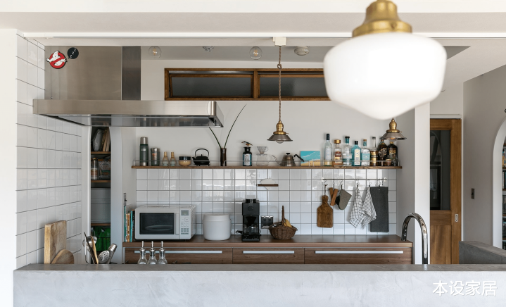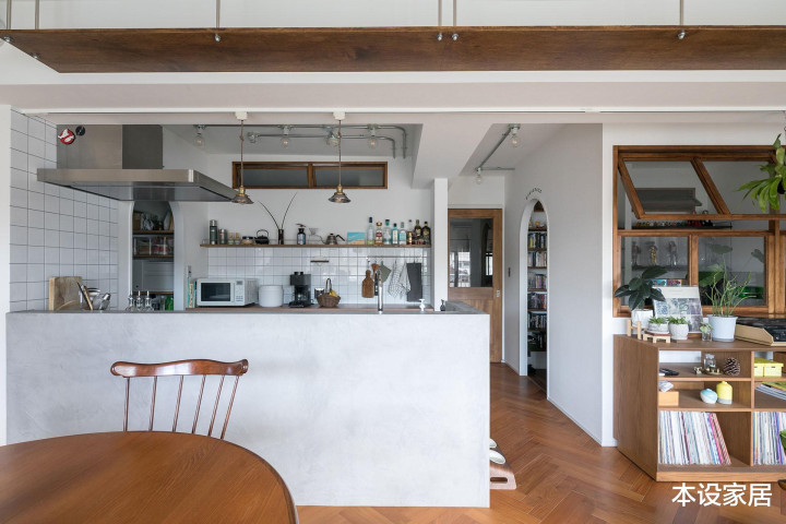 厨房紧靠餐厅,做好的饭菜转个身就能上桌,十分方便。 利用半墙高的操作台为餐厨区做了简单的空间划分,操作台外侧高出15公分,除了避免油溅外,也能遮挡平行视线操作台日常的杂乱。