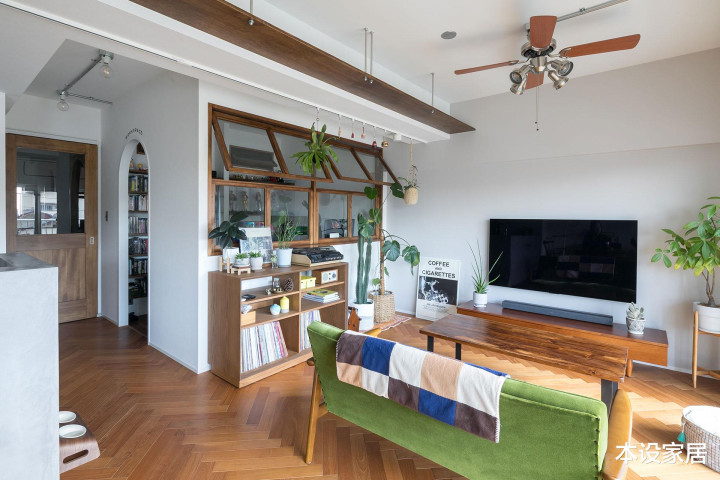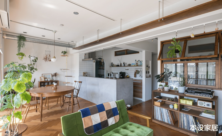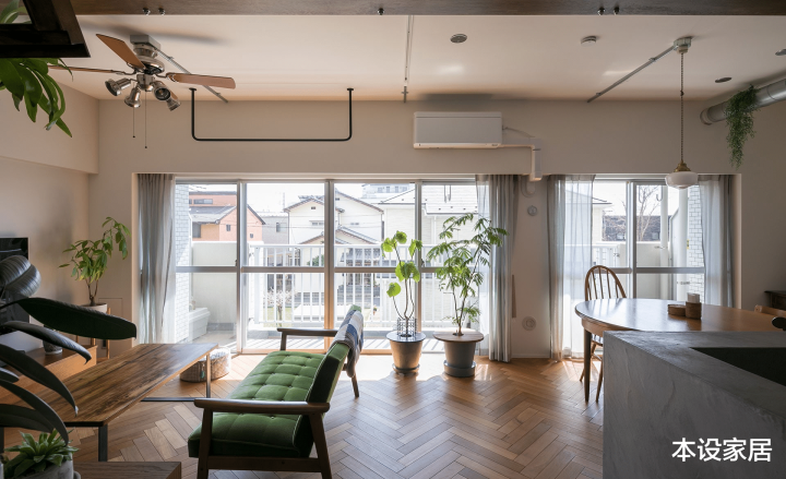 客餐厨布置在采光较好的南面,不远处是错落有致的民宅,宁静又不失人间的烟火气。 地面满铺“人”字拼实木地板,墙面刷白色漆,天花无吊顶,在绿植点缀下,呈现一种慵懒自然的气息。