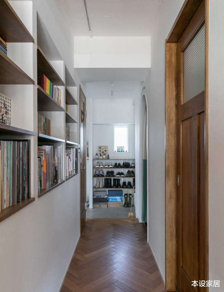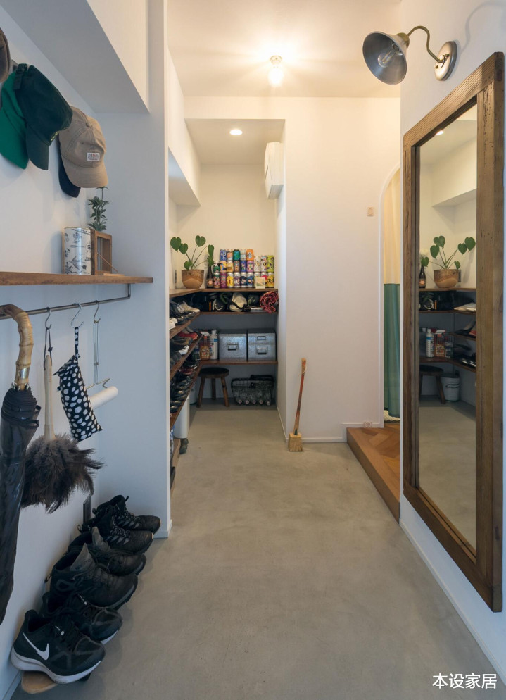 推开入户门,是经典的日式下沉玄关,除了可以减少灰尘和病菌带进内屋,也营造出一种生活的仪式感。 玄关地面做水泥自流平,耐磨好打理,在视觉上与内屋进行空间划分,夫妇俩的鞋子左右分开放置,并打扫得干干净净。 客厅