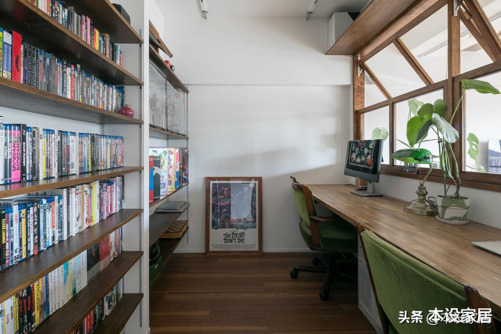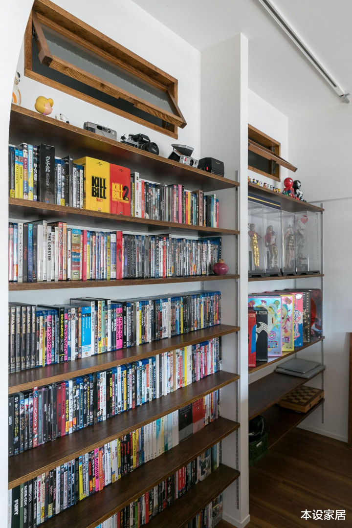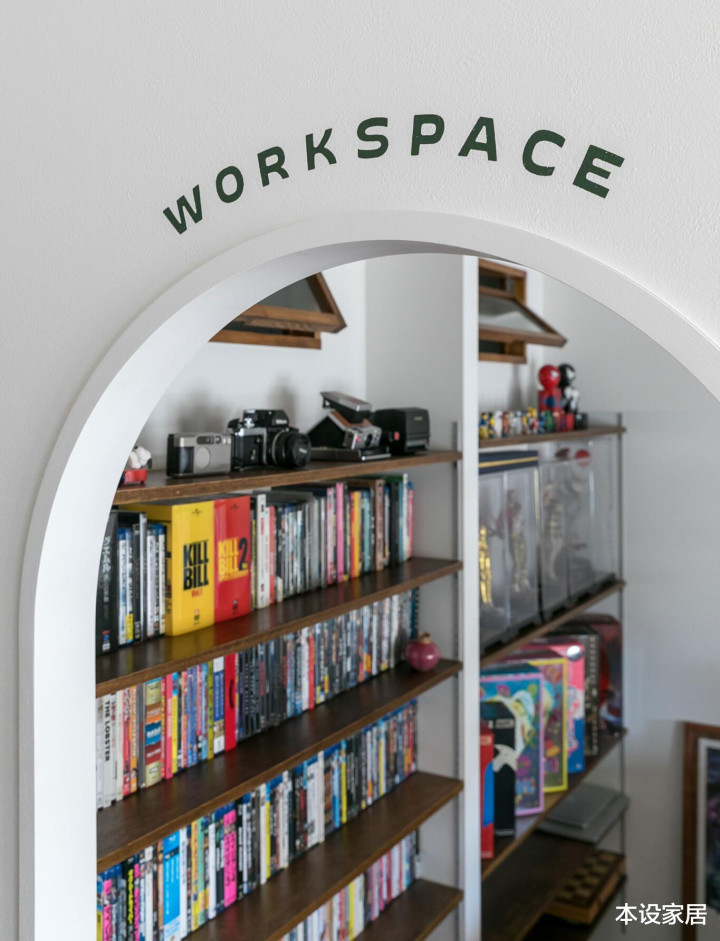 书房是夫妇俩的秘密基地,一面收纳层板柜,另一面书桌依次排开,一目了然,自带静谧感,看着都舒服。 由于当地良好的空气条件,加上这位太太良好的生活习惯,书柜即便不装柜门也不担心凌乱,也不担心落灰。