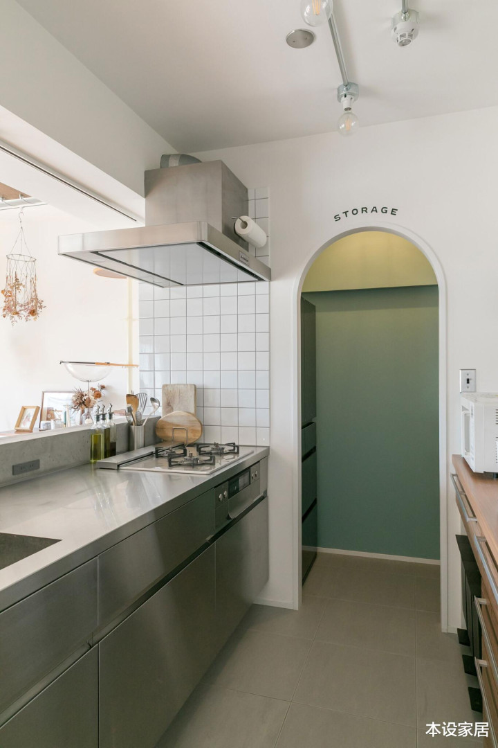 厨房区域地面铺灰色瓷砖,侧面贴白色墙砖,搭配一体的不锈钢操作台,耐脏又好打理。 另外,厨房里面还有一间小储藏室,承载了家用电器和生活用品的收纳,功能非常强大! 卧室