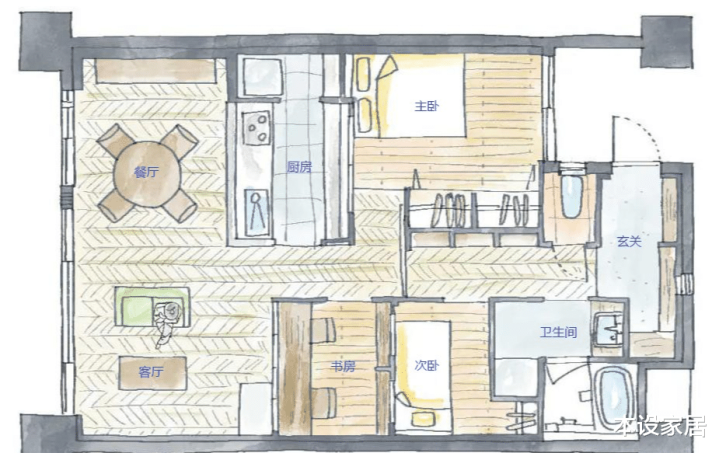 在她的家里,秉承着越简单越幸福的生活理念,不囤积,不乱买,要买就买最好,在她的老公和爱猫的陪伴下,过着“与世无争”的高雅生活。 下面跟@本设家居一起去看看,他们是如何布置舒适的两人居的。 平面布置图